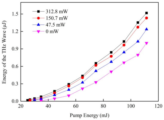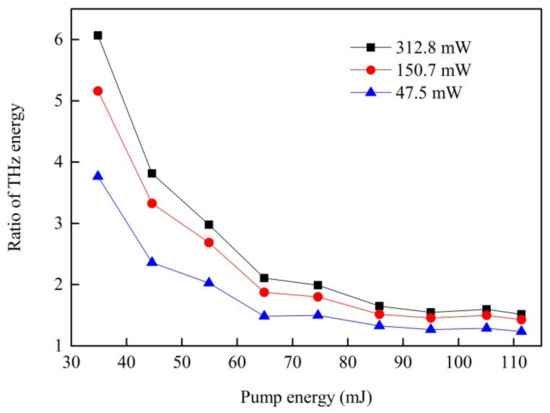 The ratios of THz energies with seed injection to that without seed injection as functions of the pump pulse energy are shown in Figure 5. When the pump energy was 34.8 mJ, the ratios for the seed powers of 312.8 mW, 150.7 mW, 47.5 mW were 6.1, 5.1, and 3.7, respectively. When the pump energy was 111.4 mJ, the ratios were 1.5, 1.4 and 1.2, respectively. The ratio can be considered as an indicator of the seed injection effect. It can be concluded that the smaller the pump pulse energy, the more obvious the effect of seed injection. As the seed power increased, the output THz pulse energy was increased, but the growth rate became slower. When the seed power was higher than 312.8 mW, the output energy did not increase significantly, so the maximum seed power was 312.8 mW in this experiment.