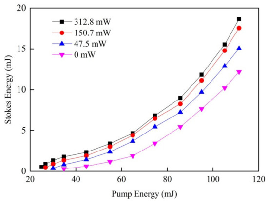 Keeping the pump power of 111.4 mJ, the spectrum of the Stokes wave without seed injection is shown in Figure 6a, and Figure 6b–d show the spectra of the Stokes waves for the seed powers of 47.5 mW, 150.7 mW, and 312.8 mW, respectively. After the seed injection, the linewidth of the Stokes wave reduced greatly. However, for different seed powers, the spectra of the Stokes waves had little change, and the linewidths kept nearly the same as that of the seed laser (about 0.2 nm). This means that after the seed injection, the spectrum of the Stokes wave is mainly determined by the seed laser.