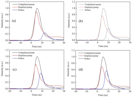 Waveforms of the pump (before and after depletion) and Stokes pulses for the seed powers of (a) 0 mW, (b) 47.5 mW, (c) 150.7 mW, and (d) 312.8 mW.