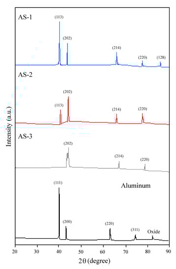 X-ray diffraction patterns of three different samples, where the pattern of aluminum is included as reference to identify how the formation of each layer of aluminum-oxide was made.