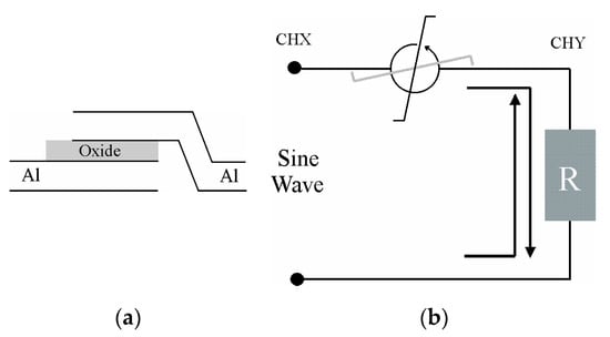 This section discusses how is the electrical conduction in aluminum-oxide layers (samples) synthesized with emphasis on knowledge of their conduction properties. Before, these samples must be cut with an area of 0.5 cm × 0.5 cm and inserted between two electrodes, as shown in the aluminum oxide-based structure of Figure 2a. Electrical conduction measurements are performed and evaluated by current-voltage plots at room temperature using a digital storage oscilloscope (Tektronix, TDS1012C). A function generator (Matrix, MFG-8250A) is used to produce the sine wave at low frequency (f = 100 Hz) with magnitude scanned from −10 V to 10 V, which is connected between the bottom and upper aluminum electrodes of an area 1 cm2, to ensure the bipolar-biased condition. These large-area electrodes acting as contacts were mechanically fixed to avoid surface deteriorating.