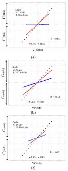 The operation in aluminum oxide-based structure has been confirmed with the practical circuit of Figure 2b. To adjust the electrical current flow through this circuit when each samples was tested, graphite-based devices dependent on their distributed resistance and assembled on SiC sheets as substrates were used as resistors []. To assess practical-circuit performance; an empirical technique well known as a transfer function for the analysis of the linear systems in control theory, is used here to correlate the current–voltage characteristics and internal states of each sample, where a relationship describing the charge carriers conduction under operation understands the ratio of the output variable to the input variable [].
