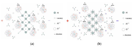Because the aluminum ions are missing in the aluminum-oxide layer, it is disordered, which means that lattice defects occur. Therefore, the oxide must exhibit properties sensitive not only to stress states, but also to other variables including aluminum vacancies, variation in oxide composition, thickness, etc. In order to know how electrical conduction is caused by the electric field applied in the practical circuit, current–voltage plots help to reveal that the Ohmic conduction observed will be strongly depended on attractive electrostatic forces, Fa, where aluminum and oxygen ions are being well polarized as shown in Figure 4a, until the injected carriers from the aluminum electrodes can be collected by these vacancies, which act as trapping sites when temperature increases from the interface.