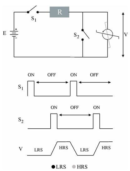To demonstrate that an aluminum oxide-based structure can provide a reasonable model for at least one type of waveform synthesis circuit, let us consider the circuit shown in Figure 5, where the timing signals to drive that circuit configuration are also included. The behavior in the switches S1 and S2 will be equivalent to applying square-wave pulses, where the changes from low-resistance state (LRS) to high-resistance state (HRS), as a function of the voltage magnitude and rise and fall times in the switches S1 and S2, must be depend on the ON and OFF states. Additionally, a memory state can occur when both switches S1 and S2 retain equal state in a specified period of time.