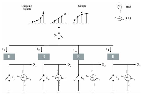 To understand this model, let us consider that each one of these circuits will consist of graphite-based resistors of growing resistor size (R1 < R2 < R3 < R4), four switches labeled as S1, S2, S3, and S4, which are equivalent to applying square-wave pulses with specified period of time, and four aluminum oxide-based structures. The resistor size depends on physical properties of the oxygen-rich oxide layers that are preferred to be used in the analog–digital conversion for the scheme of Figure 6. The scheme for analog–digital conversion suggested here is essentially a current divider, where each output Q1, Q2, Q3, and Q4 will be high-resistance state (HRS) or low-resistance state (LRS) when each switch labeled as S1, S2, S3, and S4 is open or closed. In accordance to Table 3, the operating state when an analog–digital conversion performs under three cycles: (1) conversion; (2) erasing; and (3) storing is described in the following: