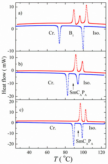 Differential scanning calorimetry (DSC) measurements were carried out on a Perkin-Elmer 7 Pyris calorimeter (PerkinElmer, Shelton, CT, USA). Phase transition temperatures and corresponding enthalpies were determined from the second heating and cooling runs, which were taken at a rate of 10 K/min. A small amount of compound (2−5 mg) was hermetically closed in aluminum measuring pans and inserted into the calorimeter working chamber. During measurements, a nitrogen atmosphere was applied for better temperature stabilization. The calorimeter was calibrated on extrapolated onset of the melting points of water, indium and zinc.