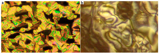 All compounds were studied by a calorimetric method; DSC measurements were performed at the heating and cooling runs. We analyzed the measured data and the phase transition temperatures and corresponding enthalpy values (Table 1). The transition peaks observed in DSC plots were sharp and revealed big enthalpy values associated with phase transitions, for demonstration see Figure 1 with thermographs for two selected compounds from the series I. We observed textures under a polarizing microscope to assess mesomorphic behavior. We found that only series I showed mesogenic properties. Namely, for shorter homologues Ia and Ib a columnar B1-type of a mesophase was established from textural features. For illustration, Figure 2a shows the planar texture for Ia with a texture typical for a columnar B1 phase. We observed colored domain-like textures, which did not respond to an applied electric field. For compounds Ic and Id from series I, a SmCP phase appeared with typical textures and specific electro-optical properties. For samples with one free surface, a schlieren texture was found (Figure 2b). In the planar textures without the electric field, we could distinguish a fine structure of stripes. Nevertheless, the averaged extinction without the electric field was oriented along polarizer’s direction. Under the applied electric field, the color of the observed fan-shaped texture slightly changed from yellow-orange to yellow-green, so we could expect that the birefringence changes. Moreover, the extinction position rotated clockwise and anticlockwise depending on polarity of the applied field (Figure 3). Such texture transformation is characteristic for a transition from the SmCAPA phase to the SmCSPF phase under the electric field. In the SmCSPF, all molecules are turned towards polarity of the applied field. The electro-optical behavior for the SmCAPA−SmCSPF transition has been described in literature [2,11,12], schematically, we demonstrated such a type of molecular reorientation in Figure 4. We expect that the molecules rotate on the conus and do not change the chirality.