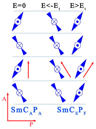 Schematic picture of molecular organization in neighbouring layers: the first column shows the original SmCAPA phase, the second and the third column demonstrate the reorientation of molecules in the applied electric field +E and −E in the SmCSPF phase. The perpendicular arrows in the bottom left corner show the orientation of polarizers, and the red arrows mark the orientation of the average molecular axis.