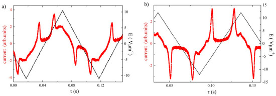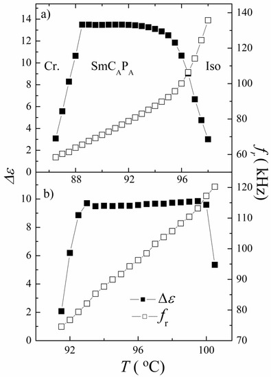 Electric field was applied using driving voltage from generator Philips PM 5191 (Philips Eindhoven, Netherlands), the signal was amplified to reach the maximum amplitude of about ±120 V. A Tektronix DPO4034 digital oscilloscope (Tektronix, Beaverton, OR, USA) was utilized to obtain information about the switching current profile vs. time. Dielectric spectroscopy was measured by Solartron impedance analyser (Solartron Analytical, Farnborough, UK) to establish complex permittivity, ε*(f), in frequency range 10 Hz to 10 MHz. The real, ε’, and imaginary, ε’’, parts of permittivity were fitted to the Cole−Cole formula: