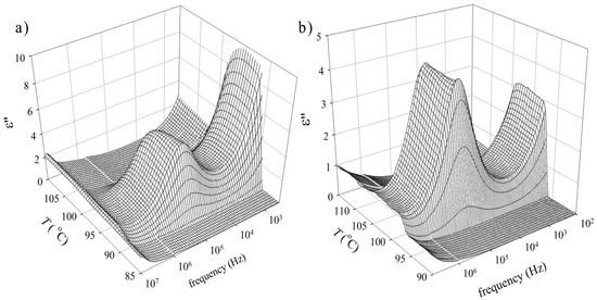 Dielectric spectroscopy results: the imaginary part of permittivity, ε‘‘, versus frequency and temperature, T, for compounds (a) Ic, and (b) Id.