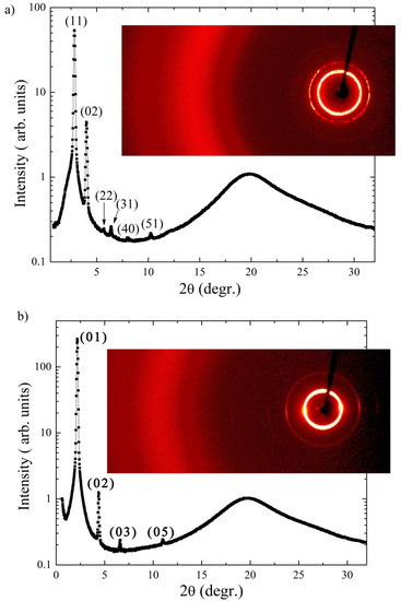 X-ray intensity profile with respect to the scattering angle (a) for Ib in the B1 phase at T = 100 °C, and (b) for Ic at T = 95 °C. Miller indexes are placed above the corresponding peaks.