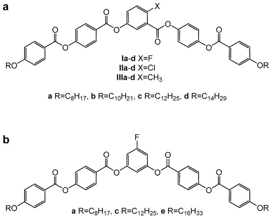 In this study, we have focused on the mesomorphic behavior of bent-core liquid crystals bearing the lateral substituent in the apex position of the core. Previously, we documented for derivatives of 3-hydroxybenzoic acid with lateral substituents in position six that only materials bearing the smallest substituent (fluorine) exhibited mesomorphic behavior while other substituents caused crystallinity of the substances [34]. In this particular case, the mesomorphic behavior was highly dependent on the number and orientation of the ester linkages. Tuning the orientation of the ester groups (Figure 9a), it was possible to induce the formation of an enantiotropic columnar B1 phase and lamellar SmCAPA phases. In the case of methyl and chlorine as the substituents in the apex position, only monotropic B1 and an enantiotropic SmCAPA phase for the materials with longest terminal alkyl chain (C14H29) were observed. Subsequently, this plausible orientation of ester linkages was adopted also for the materials studied here. Despite the optimum number and orientation of the ester linking units, only the fluoro-substituted materials I exhibited mesomorphic properties. It is reasonable to assume that in the case of materials of series II–IV, a negative steric effect of larger substituents hinders the formation of a mesophase. Similar behavior has already been discussed for 5-substituted resorcinol-based materials (1,3-phenylene bis[4-(4-alkyloxyphenoxycarbonyl)benzoates, (Figure 9b) for which all studied fluoro-substituted homologues exhibited a SmCPA phase, while other lateral substituents were not tolerated [29]. It should be noted that the electronic effect of the substituents is less likely to affect the physical properties of the materials. The lateral substituents are located in meta-position to the functional groups connecting the elongating side arms and, thus, cannot significantly affect their electronic state and, consequently, their conformation.