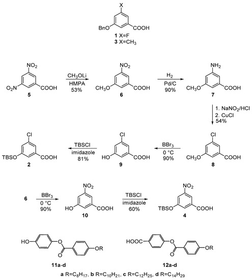Synthesis of the 5-fluoro (1) and 5-methyl-3-hydroxy protected benzoic acids (3) has been described elsewhere [36]. Preparation of the corresponding 5-chloro 2 and 5-nitro-3-hydroxy protected benzoic acid (4) is depicted in Scheme 1. While the hydroxylic group of the fluoro and methyl substituted central cores 1,3 was protected by benzyl group (Bn), for synthetic reasons protection of acids 2 and 4 was achieved by tert-butyldimethylsilyl group (TBS).