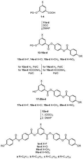The series of target materials Ia–d (X = F), IIa–d (X = Cl), IIIa–d (X = CH3), and IVa–d (X = NO2) (Scheme 2) were prepared by the same methodology as previously [18,19,20]. First, the acids 1−4 were coupled with the substituted phenols 11a–d in the presence of N,N’-dicyclohexylcarbodiimide (DCC) and N,N-dimethylaminopyridine (DMAP) as catalyst to yield the protected (PG = protecting group) intermediates 13a–d–16a–d. The protecting group was removed with respect to its character. While for the deprotection of the benzyl group (PG = C6H5CH2) transfer-hydrogenation using Pd/C and ammonium formate was utilized, the silyl moiety (PG = (CH3)3CSi(CH3)2) was removed by the means of tetrabutylammonium fluoride (Bu4N+ F−) in wet tetrahydrofuran [39]. In the last step, the hydroxy esters 17a–d-20a–d were acylated with acid chlorides of acids 12a–d in the presence of DMAP as a base yielding target compounds of series Ia–d (X = F), IIa–d (X = Cl), IIIa–d (X = CH3), and IVa–d (X = NO2), respectively.