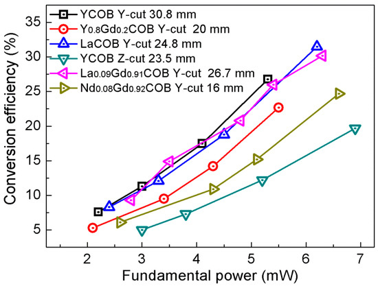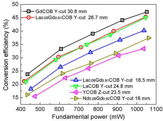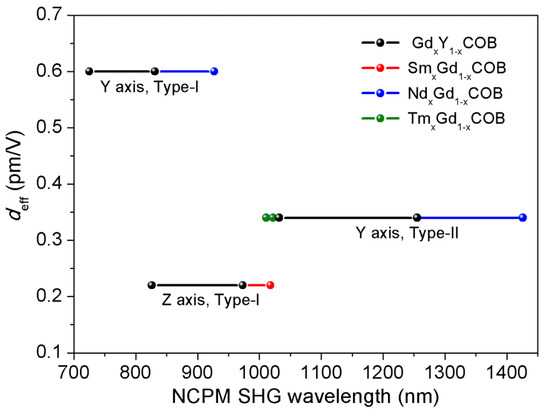 - Liu, Y.; Wang, Z.; Yu, F.; Qi, H.; Yang, X.; Yu, X.; Zhao, X.; Xu, X. Angular non-critical phase-matching second-harmonic-generation characteristics of RECOB (RE = Tm, Y, Gd, Sm, Nd and La) crystals. Opt. Express 2017, 25, 11867–11893. [Google Scholar] [CrossRef] [PubMed]