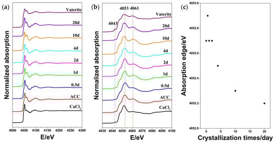Proto-vaterite ACC was synthesized as a precursor using gas diffusion method, which was then crystallized for 0.5, 1, 2, 4, 10, and 20 d, respectively. To simplify description, we term the calcium carbonate samples with different crystallization times, e.g., vaterite-0.5d means the sample was crystallized for 0.5 d while it may still contain a certain amount of proto-vaterite ACC. Herein, freshly prepared calcium carbonate samples with short crystallization times (from 0.5 to 4 d) were immediately characterized using XAS, while calcium carbonate samples obtained after long crystallization times (10 and 20 d) were prepared in advance for XAS measurement. Ca K-edge X-ray absorption near edge structure (XANES) spectra of CaCl2, proto-vaterite ACC, samples crystallized for different times and vaterite reference were shown in Figure 1. XANES spectra of other well crystallized calcium carbonate samples, calcite and aragonite were also performed as references (Figure A1). XANES data for proto-vaterite ACC, sample crystallized for 10 d (vaterite-10d) and three well-crystalline reference crystals (calcite, aragonite, and vaterite) were shown in our previous work [33]. There are significant differences for the Ca K-edge XANES data of the three crystalline references of calcium carbonate, calcite, vaterite and aragonite, indicating that the local chemical environments around Ca ions of the different crystal phases are different from each other.