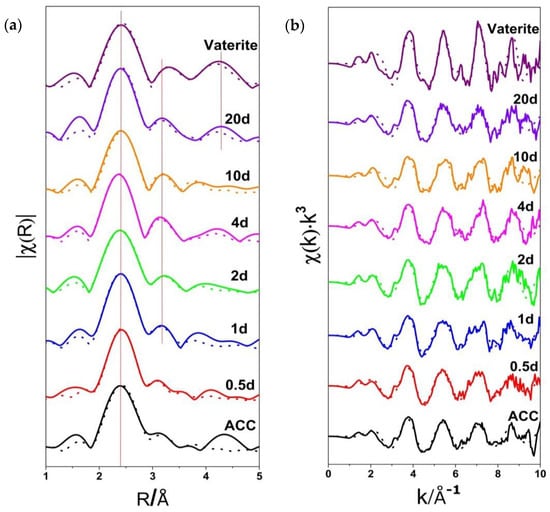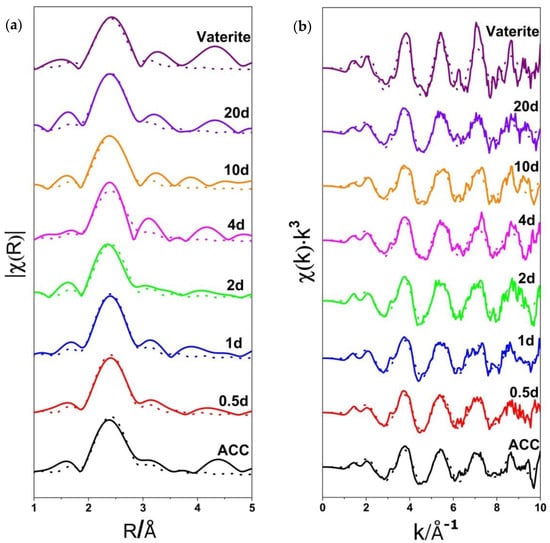 Ca K-edge extended X-ray absorption fine structure (EXAFS) spectra for the first coordination shell of the experimental data (solid line) and the fitting results (dotted line) for proto-vaterite ACC, samples crystallized for different times and well-crystalline vaterite reference plotted in R space (Fourier transform magnitude) (a) and k space (b).