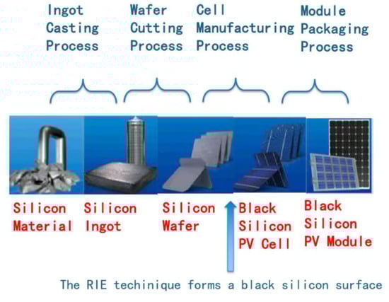 The production of p-Si PV modules in the factory is mainly made by silicon materials, which is completed through four processes: Ingot casting, wafer cutting, cell manufacturing, and module packaging. After the wafer cutting process, the black silicon wafer was prepared by RIE technology, and then the following cell manufacturing and module packaging processes were carried out to form the black silicon PV cells and the black silicon PV modules. The entire production processes of traditional p-Si PV modules and the insertion location of black silicon texturing by the RIE technique are shown in Figure 1. The RIE is the core of the black silicon technology. Nanoscale holes were prepared by bombarding the surface of silicon wafers with SF6 plasma. The reaction equation is Si + SF6 + O2 + Cl2 → SiF4(g) + SiCl4(g) + SiFxOy(s) + SOFx(s). Pre-cleaning and post cleaning were required before and after the RIE process. The RIE equipment used in this study was from Changzhou Bitai Technology Co., Ltd. (Changzhou, China).