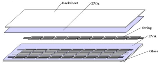 The third experiment of this study focused on the module packaging process. The purpose of the steps were to analyze which types of components in the module can better match the black silicon cells. After obtaining the PV cell, it enters the module packaging process, including the soldering of the cells and the packaging of the module. Benefitting from the high light trapping and low reflection, the black silicon cells have higher Eff, resulting in a higher photo-generated current. Due to the high current, the packaging loss of PV modules made by black silicon cells is high, so it is necessary to study the optimization of module packaging. The main means to reduce the packaging loss of PV modules is to reduce their electrical and optical losses. This experiment was mainly on the selection and matching of various reflective components in welding and packaging, to reduce the packaging loss of black silicon PV modules and obtain optimal packaging scheme. Specifically, the performances of PV modules were optimized according to the selection of glass, ethylene-vinyl acetate copolymer (EVA), back sheet, and soldering strip required for soldering of the cell string in the PV module packaging structure, as shown in Figure 4.
