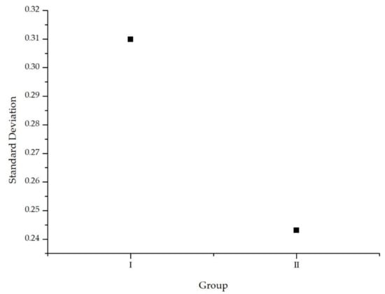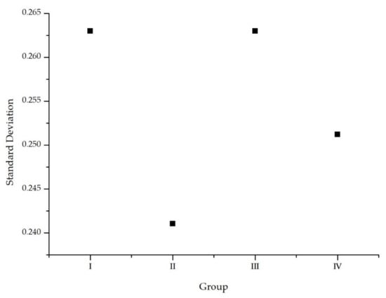 According to the specific operations in Table 4, for group II, III, and IV, the parameter A is 2000, 2200, and 2500 SCCM, respectively. The four groups subsequently adopted a consistent PECVD step and contact printing step. The electrical performance results and differences of the four groups of black silicon PV cells obtained are shown in Table 5. The standard deviation of the cells’ Jsc of each group of samples is shown in Figure 8.