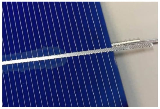 In the third experiment, how to match the module packaging process with the black silicon cell is an important problem. Here, the cells in group III completed in the second experiment were used directly. According to the standard PV module specifications, one PV module was composed of 60 cells. All the cells were divided into seven groups (five modules per group) for packaging, and each group realized different packaging methods. Different packaging methods are mainly about the selection of components, as shown in Table 6. These components include the glass, the soldering strip on the cell string, the reflective film on the soldering strip, the front EVA, the back EVA, and the back sheet, as mentioned in Figure 4 above. Regarding the selection of glass, coated reinforced glass is generally chosen. Group VI and group VII belong to the type of dual-glass PV module, whose back sheet is replaced by glass. The thickness of glass used in the dual-glass PV module is different from that of the conventional (back sheet) PV module. These two groups also play a role in comparing the matching of the black silicon cell in the dual-glass PV module and conventional PV module. The selection of the soldering strip is mainly between the traditional (flat) soldering strip and the twill soldering strip. The twill soldering strip is a twill structure formed on the copper base of the soldering strip (tin-plated copper strip) to increase the reflected light on the surface, as shown in Figure 9. The reflective film of the solder strip refers to a film coated with reflective material affixed to the surface of the solder strip. When the sunlight shines on the solder strip, it will form multiple reflections between the reflective film and the inner interface of the glass, which may cause the light to shine on the cell again. However, the reflective film can only be attached to the traditional solder strip. Therefore, one of the conclusions to be drawn in this experiment is whether the flat soldering strip, the flat soldering strip with the reflection film, or the twill soldering strip is more suitable for the black silicon cell. In order to make the cell better absorb light, the front EVA is often a highly transparent material, while the back EVA is more suitable to be white or transparent, which is also a question we want to prove. Because of the combination of the above problems, seven comparison groups were needed in the experiment. In addition to the selection of the above materials, the aluminum alloy frame and terminal box do not involve the process of light irradiation of the cell, so they have little effect on the performance of the black silicon cell. In the experiment, the same aluminum alloy frame and terminal box were used to ensure that these components would not cause errors. Group I adopted the traditional module packaging process, as a reference group.