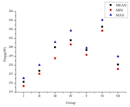 After the packaging experiment, the electrical performance results of the seven groups were obtained, as shown in Table 7, where Impp refers to the current of the maximum power point (Impp) and Umpp refers to the voltage of the maximum power point (Umpp). Pmpp refers to the power of the maximum power point (Pmpp) and, for modules, to their output power.