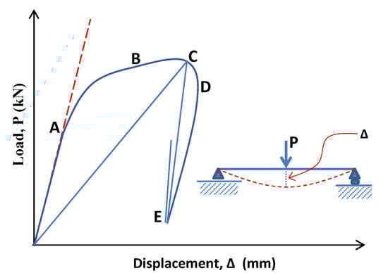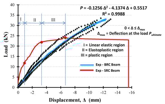 14] and the BRC beam flat back. This shows its compatibility with bamboo strain–stress behavior. The load vs. deflection relationship of the SRC beam shows the existence of an elastic limit, elasto-plastic limit, and plastic, as shown in