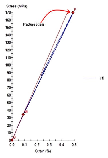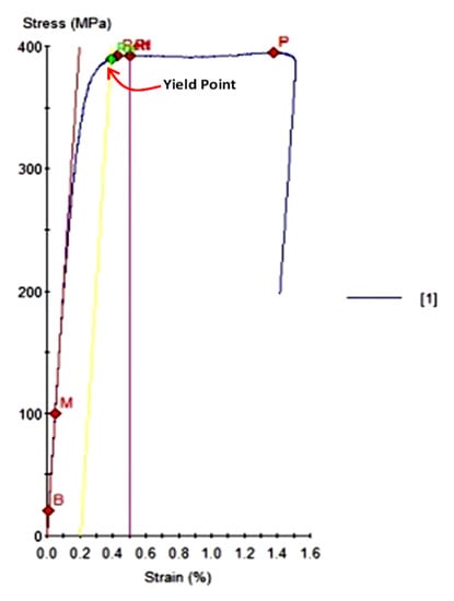 Figure 6. Steel reinforcement shows a clear melting point, whereas bamboo reinforcement does not show a clear melting point. Both of them show a clear stress fracture point, but in bamboo reinforcement, after fracture stress occurs, the strain–stress relationship pattern tends to return to zero, as shown in
