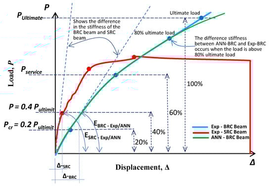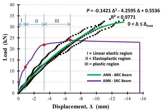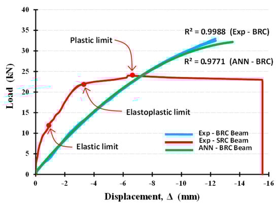 Figure 15 shows the combined relationship of the load vs. deflection beam of the experimental BRC beam and the ANN analysis results.