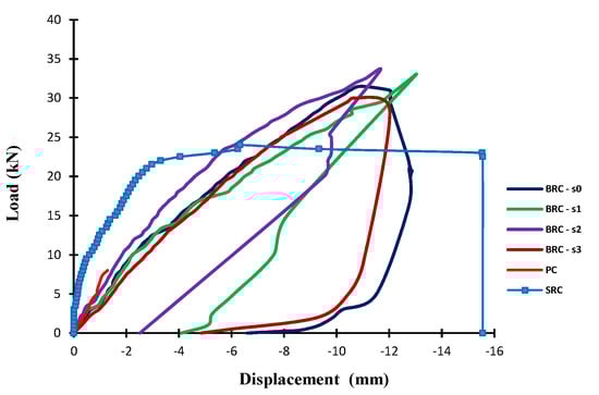 Figure 7. While the relationship of load vs. deflection of the BRC beam shows a linear line until the maximum load limit and after the peak load, the deflection returns to zero, as shown in