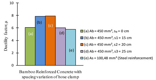 Table 1 shows that the initial crack (elastic region) of the BRC beam is in the range of 20% of the ultimate load and 40% of the ultimate load for the SRC beam. Whereas the effect of installing hose-clamps on bamboo reinforcement on the ultimate load of BRC beams is optimum at a distance of 20 cm (BRC-s2) and decreases at a distance of 25 cm, this indicates that installing hose-clamps that are too tight will reduce the elastic properties of bamboo reinforcement and decrease its ductility, as shown in