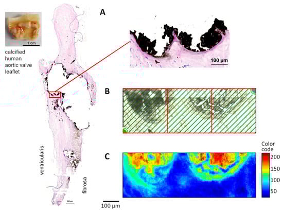 Von Kossa/HE staining of human AV sample with region analysed in FT-IR spectroscopic imaging. (A) calcified human AV leaflet and resulting histological von Kossa/HE staining. The original aortic valve leaflet is shown on the left (fibrosa side) and the image with higher magnification is on the right. (B) resulting brightfield and (C) IR spectroscopic image of the region analysed by IR spectroscopic imaging.