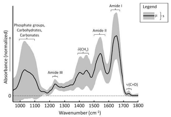 The mean (the bold line) and the standard deviation (grey area) are shown in Figure 2. Absorption bands of amide I (1600 cm−1–1700 cm−1) and amide II (1500 cm−1–1600 cm−1) dominate the spectral profile. Other, weaker absorption bands arise from CH groups of proteins and lipids located around 1400 cm−1 and 1460 cm−1. The broad absorption band between 1000 cm−1 and 1150 cm−1 mainly originates from phosphate groups, carbohydrates and carbonate groups [45].