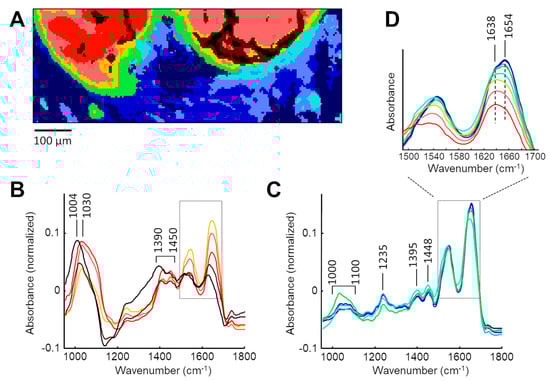 In contrast to Figure 3B, the centroid spectra plotted in Figure 3C show the typical absorption profile of soft tissue. Proteins are represented by the amide III band at 1235 cm−1 as well as by the amide II and amide I modes (see Figure 3D) [18]. Two weaker absorption bands at 1395 cm−1 and 1448 cm−1 are attributed to deformation modes of CHx- groups [18]. The broad absorption signal between 1000 cm−1 and 1150 cm−1 was composed of many overlapping absorption bands among other things due to carbohydrates and phosphate groups of DNA. Only the green cluster indicates marginal mineralization by a slightly stronger absorption at 1030 cm−1. Clearly, the infrared spectrum captured a wealth of chemical information and slight variations in the band positions, and intensities revealed heterogeneity across the tissue section. Although the centroid spectra that represent no or marginal mineralization are quite similar, the enlarged plots of the amide I and amide II regions (Figure 3D) show a shift of the amide I band maximum. The variation of the amide I spectral profile, especially of the maximum band position, indicates alterations in the secondary structure. Alpha helical structures show an absorption maximum at 1654 cm−1. β-sheets exhibit a maximum band position at lower frequencies [18]. Therefore, we interpreted the shift of the amide I band from 1654 cm−1 to 1636 cm−1 as an increase of β-sheet structures. More β-sheet was observed for regions where the mineralization process had been identified as advanced (orange and reddish pixels).