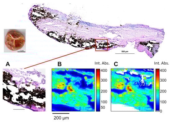 Von Kossa/HE staining of a calcified bioprosthesis sample with region analysed in FT-IR imaging. (A) calcified bioprosthesis sample and resulting histological von Kossa/HE staining“ (entire section in the upper panel). (B) IR spectroscopic image (brightfield image) and (C) IR spectroscopic image after preprocessing. White pixels indicate outliers.