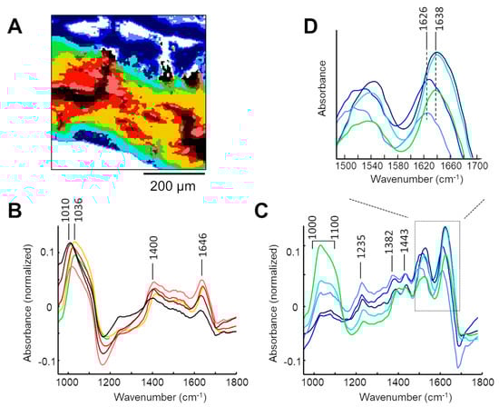 Results of k-means cluster analysis of the spectroscopic data set registered from the calcified AV prostheses (see Figure 4). (A) assignment of clusters. (B) corresponding cluster centroid spectra of the predominantly mineralized regions. (C) cluster centroid spectra of regions that contain a certain protein fraction. (D) enlarged plot in the region of amide I and amide II bands.