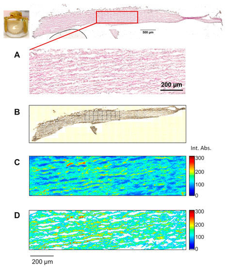 Similar to Figure 1; Figure 4, staining by von Kossa combined with HE was performed on consecutive sections of non-implanted bioprosthesis tissue of bovine pericardial origin (Figure 6A). No mineralization was detected. The selected FT-IR imaging region and the resulting intensity images are shown in Figure 6B–D.