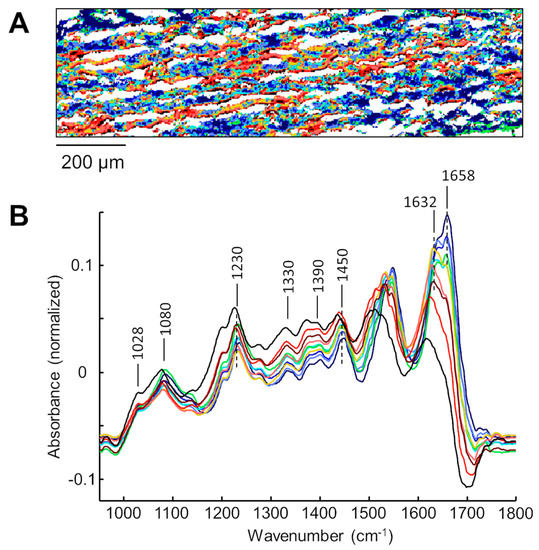 Figure 7 shows the result of the k-means cluster analysis of the non-implanted prosthesis. The pattern of cluster assignment in Figure 7A shows substantial variances that must be accounted for in the prospect of characterizing the prosthesis. However, the centroid spectral profiles (Figure 7B) appear at first glance to be quite similar to one another. The spectra are dominated by the amide I band between 1600 cm−1 and 1700 cm−1 and the amide II band between 1500 cm−1 and 1580 cm−1.