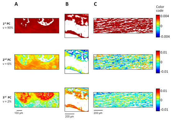 Results of PCA of the spectroscopic data set showing score images of (A) mineralized aortic valve leaflet, (B) mineralized AV prosthesis and (C) non-implanted prosthesis. Score images are printed in the rainbow colour code where blue colours represent low values and red colours high values. Gray pixels indicate a score value of zero, and white pixels represent spectra that were not involved in PCA. The percentage values display the amount of variance covered by the particular PC.