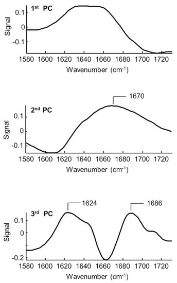 To address this question, the variation of the amide I band was analysed by PCA. PCA provides a rapid way to assess variation within the spectral data set, and it assumes no explicit statistical model underlying the variance of the original spectra. Principal components (PC) are formed by loading plots and score images. The loading plots correspond to spectral bands where the variation is highest and weight the signals in the positive and negative direction. The score map reveals the weight of the loading plot for each pixel of the image. PCA is applied on the spectral range of the amide I band between 1580 cm−1 and 1730 cm−1.