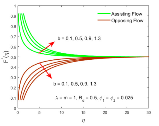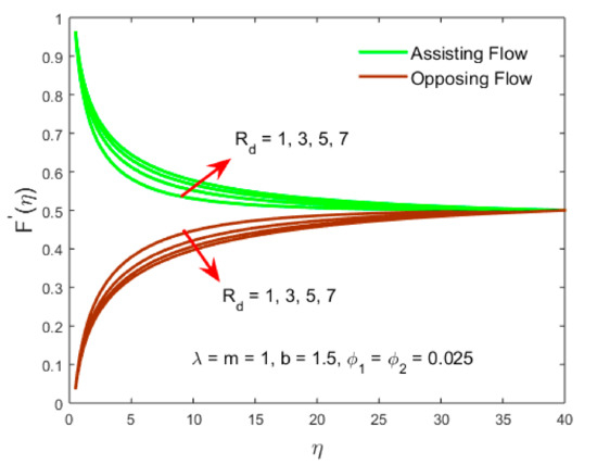Figure 8 and Figure 9 highlight the stimulus of radiation parameter on the velocity distribution against the similarity variable of the two distinct phenomena such as the assisting and opposing flows as well as for the type A nanofluid and type B hybrid nanofluid. It is clear from Figure 8 as depicted graphically that the velocity distribution augments for the ASSF and declines for the OPPF as the value of the radiation parameter upsurges. The solution behavior is similarly observed like Figure 2 while the contrary behavior of the outcomes in Figure 5 is seen for both the cases ASSF and as well as in the OPPF, while in comparison the influence between the curves is less. Additionally, is exploited to drop the molecules of liquid into hydrogen. Figure 9 displays that the velocity upsurges are owed to magnifying the radiation parameter for the type A nanofluid as well as for the type B hybrid nanofluid. The motion of the fluid flow for the type A nanofluid is superior as compare to the type B hybrid nanofluid. In addition, the solution impact in the curves for the velocity gradient is more owing to the impact of radiation parameter as compared to the significant impact of the other two parameters which is exercised in Figure 4 and Figure 7, respectively.