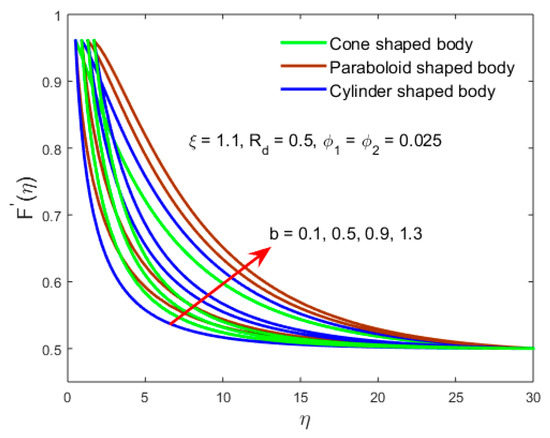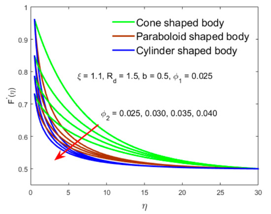 Additionally, it explains that the thickness of the velocity and the (MBLF) declines with for the ASSF and augments for the OPPF. The outcome of the velocity gradient in Figure 5 is showing a contrary behavior in both the cases of ASSF and OPPF as we compare with the solution curves of Figure 2. From Figure 6, it is transparent that due to the shape bodies, the velocity field is decelerated for the higher impact of . In comparison, the flow of the velocity field over the cone shape body is finer than the rest of the two-shape body. Generally, the velocity upsurges due to the fact that type B hybrid nanofluid dynamic viscosity has an inverse relationship to nanoparticle volume fraction. Hence, an augmenting in guides to the decline’s viscosity of base liquid and therefore speeds up the motion of the liquid flow.
