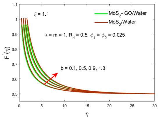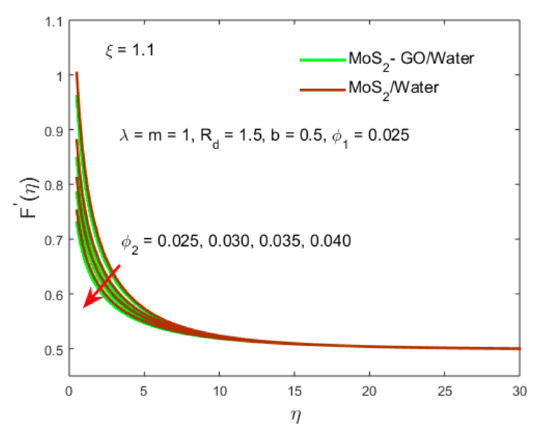 Moreover, the velocity profile reduces due to for the type B hybrid nanofluid and type A nanofluid as portrayed in Figure 7. The impact between the curves is very minor for the parameter while the outcome for the type B hybrid nanofluid is higher than the type A nanofluid.