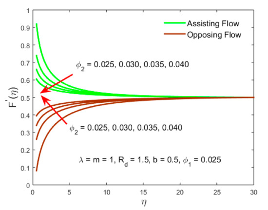 Shows the variation of the velocity profile for the case of assisting and opposing flow versus the similarity variable for the distinct values of the volume fraction of nanoparticle .