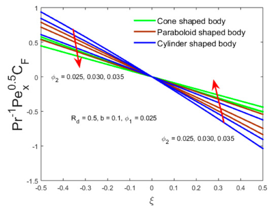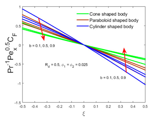 - The skin friction under the distinct shape bodies and along the type A nanofluid and type B hybrid nanofluid are augmented for both parameter and along the x-axis of the slender sheet in the range while vice versa in the range .