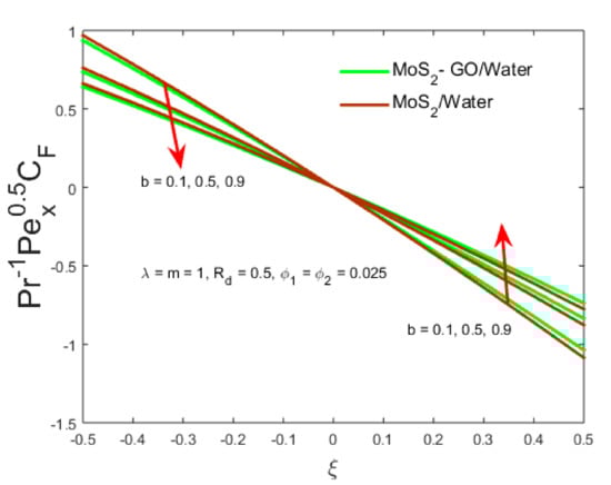 The primary intention is to scrutinize the characteristics of generalized hybrid nanoliquid for the mixed convective flow comprising MoS2-Go nanoparticles through slender revolution bodies. The non-linear Equation (15) with boundary restrictions (Equation (16)) has been worked out numerically via Lobatto IIIa formula. The thickness of the boundary layer is considered as 30 for convergence of profiles asymptotically which is essential for this type of problem. Table 2 represents the thermo-physical characteristics of the base and nanofluids. The outcomes of the sundry parameters in the presence of the water-based fluid and the type B hybrid nanofluid on the field of velocity distribution and the skin friction have been examined in Figure 2, Figure 3, Figure 4, Figure 5, Figure 6, Figure 7, Figure 8, Figure 9, Figure 10, Figure 11, Figure 12 and Figure 13. For validation, the results of the current problem have been compared with the outcomes of Ahmad et al. [34] and Saleh et al. [35] as shown in Table 3. An excellent harmony is seen. Whereas the numerical values of types B and C hybrid nanofluid for (ASSF) as well as for (OPPF) are displayed in Table 4 and Table 5.