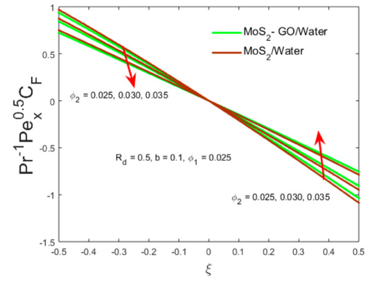 The outcomes, indicating from these tables the type B hybrid nanofluid, are superior to the type C hybrid nanofluid. Moreover, in case of the assisting flow, the skin friction increases by 0.979% for the type B hybrid nanofluid whereas the skin friction in the type C hybrid nanofluid augments by 1.001%. As the value of the nanoparticle volumetric fraction increases, the skin friction decreases continuously for both types of hybrid nanofluid. In contrast, the skin friction decreases up to 0.435% for the type B hybrid nanofluid due to the fixed value of the parameter in the example of opposing flow while for the type C hybrid nanofluid, it is decreased by 0.446%. Due to very small negligible differences in the outcomes of both the types of hybrid nanofluid, therefore the computation throughout the paper is done only for the type B hybrid nanofluid.