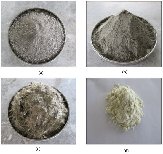 The materials used in the composition of the concrete mixes of the experimental study that includes (a) aggregate (b) cement (c) basalt fibers (d) alginate powder.