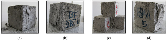 The compressive strength tests were according to ASTM C109-08. Mortar specimens were cast in triplicate cubic 50 × 50 × 50 mm and tested for each mixture, after 28 days of water curing. Axial compressive load was applied to the specimen by a 3 MN capacity compressive testing machine. The compression load was applied continuously with a rate of 2.4 KN/s according to ASTM C31. The load was applied until the specimen reach its ultimate load-bearing capacity and failure occurred. Further discussion on behavior and mechanics of composites are provided in Cristescu et al. [30], Singh et al. [31], Abdi et al. [32], and Koloor and Tamin [33]. The stress and load were measured and recorded in MPa and KN, respectively. The failure patterns of the specimens under compressive load are given in Figure 3.