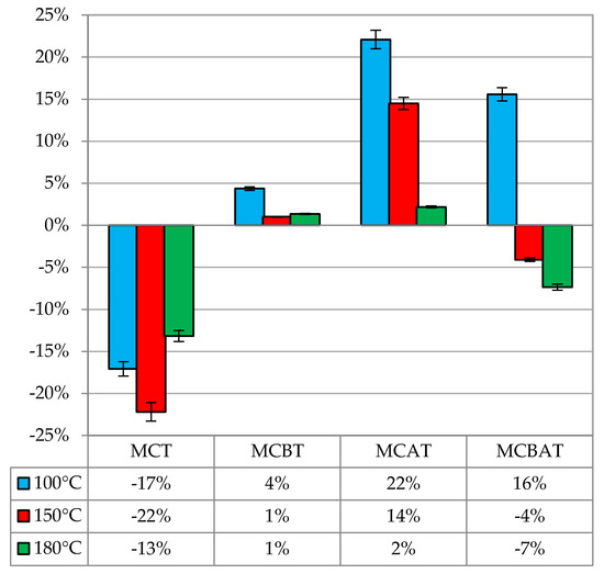 The compressive strength of the mixes compared to the reference mortar specimens maintained at room temperature are shown in Figure 4. The obtained results of the samples maintained at room temperature show that the addition of BF or alginate decreased compressive strength. A smaller reduction in compressive strength was observed by the addition of 0.2% of BF in the mortar mix, compared to the specimens containing alginate. The reduction of the compressive strength by the addition of BF is in agreement with the data published by other authors [24,25,29]. This decrease is mainly due to the compactness reduction of the composite caused by the introduction of voids into the matrix during incorporation of the fibers. However, the observation during compressive tests indicated that the specimens containing FB did not exhibit brittle failure but rather a ductile, plastic failure and the mortar showed the ability to absorb a large amount of plastic energy under compressive loads.